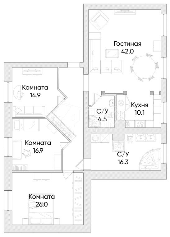 - Просторные изолированные комнаты (26+17+15м),
