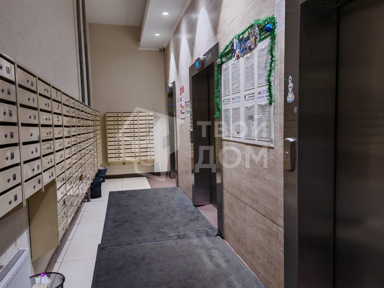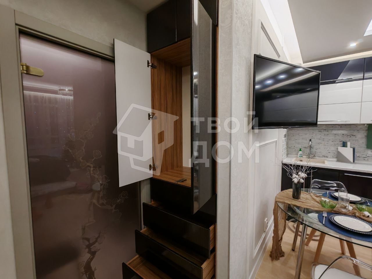 Гостиная и спальня: Кровать с пружинным матрасом и подъемным механизмом, телевизор на поворотном кронштейне, 5-зонное освещение, робот пылесос, два платяных шкафа с ящиками для белья, утюг, компактная гладильная доска. Есть место для размещения рабочего стола для пк на 90 см шириной (сейчас там стоит кресло, но после праздников оно, по желанию, перемещается на место елочки).