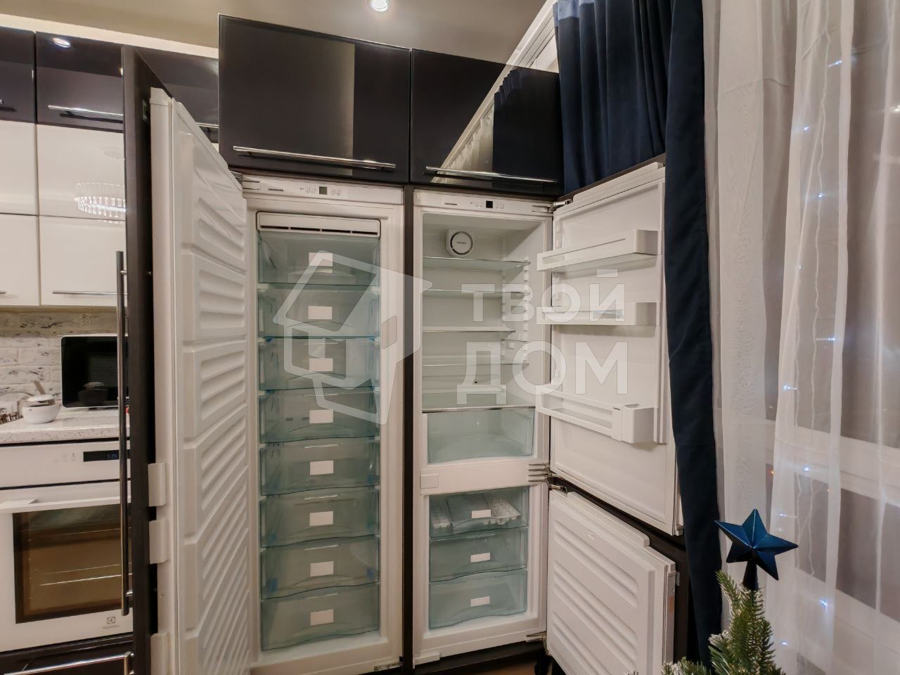Техническое оснащение квартиры: Кухня: Фильтр питьевой воды, индукционная варочная поверхность, духовка с паровым режимом, посудомоечная машина, стиральная машина, вытяжка, двухкамерный холодильник, дополнительная полноразмерная морозильная камера, набор необходимой посуды.