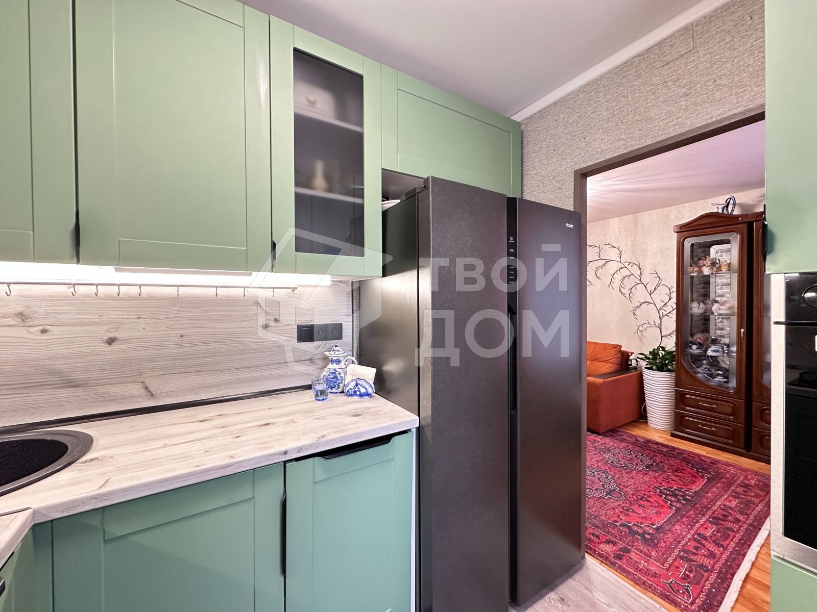 - В зону кухни встроен функциональный новый гарнитур с техникой (двухсекционный холодильник Haier, газовая варочная панель Haier, вытяжка Haier, посудомоечная встроенная машина Haier, духовой шкаф Grundic