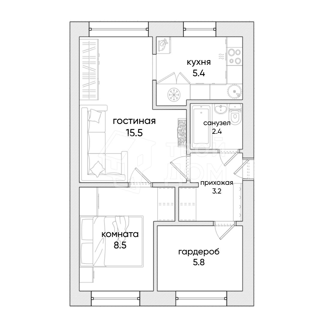 - Полное оснащение мебелью и техникой согласно дизайнерскому проекту