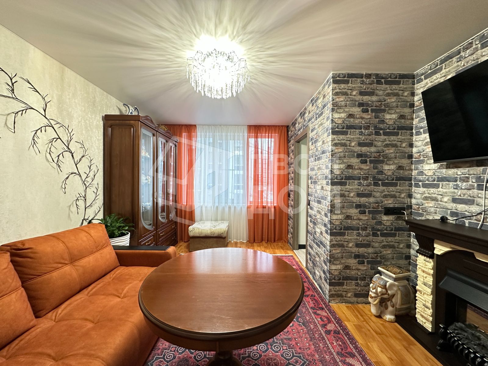 - Гостиная включает просторную зону отдыха, в которой расположен функциональный диван, телевизор, а также обеденный стол со стульями и электрокамином