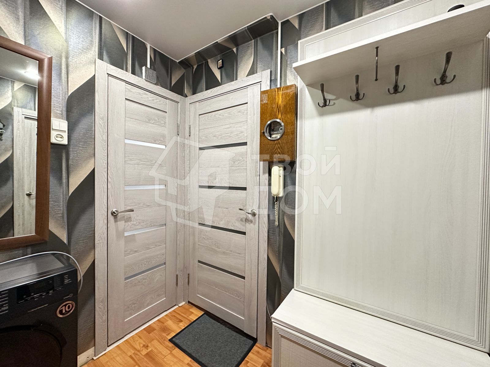 - Просторная гардеробная с зеркалом и удобными полками позволяет оптимально разместить все вещи