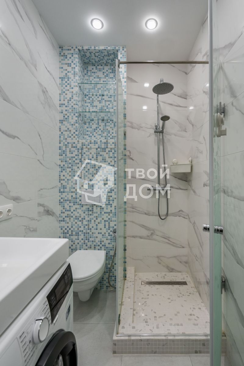 - Оборудованная кухня с встроенной техникой (духовой шкаф и варочная поверхность), шкаф-кровать (трансформер), в санузле застекленная душевая кабина на подиуме, гигиенический душ