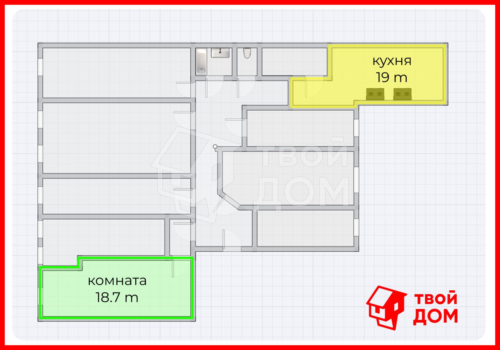• Просторная комната площадью 18,7 кв.м. правильной формы — легко зонируется на жилую и рабочую зоны