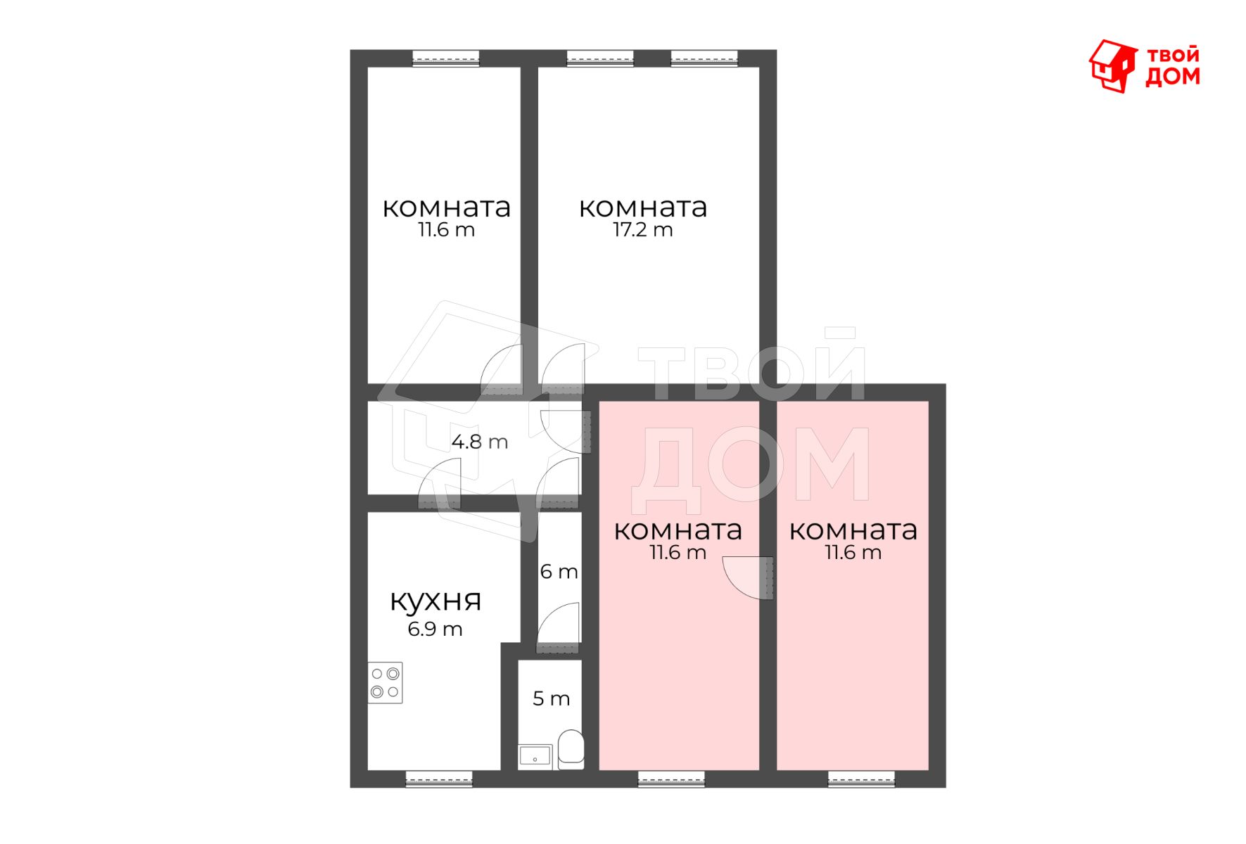 Комнаты правильной прямоугольной формы по 11.6 м.кв. каждая.